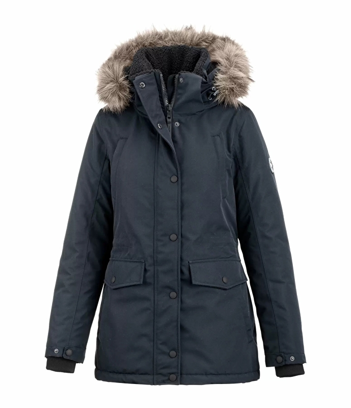 Wyjątkowo ciepła zimowa kurtka do jazdy konnej z wysokim, regulowanym kapturem, który ma odpinany kołnierz ze sztucznego futra z zamkiem błyskawicznym i możliwością zamocowania z tyłu. Wodoodporny (5000 mm), wiatroodporny i oddychający materiał. Wypełnienie z imitacji puchu, regulowane mankiety z gumką w pasie z prążkowanego materiału, 2 kieszenie z patkami, w tym kieszenie wsuwane z przodu, 2 kieszenie na piersiach zapinane na zamek, kryty dwukierunkowy zamek błyskawiczny z przodu, 2 wywietrzniki z zatrzaskami z tyłu. Dzięki podszewce z pluszowego futra i puszystemu polarowi sherpa w kapturze i po wewnętrznej stronie kołnierza, ten płaszcz jest wyjątkowo miękki. Regulowana talia, na rękawie naszywka Felix Bühler. 100% poliestru.