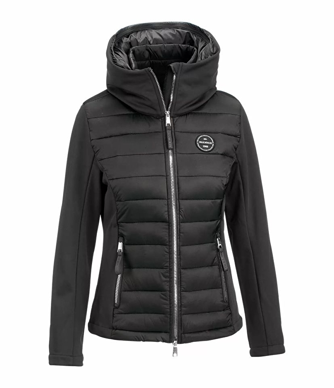 Niezwykle elegancka kurtka jeździecka wykonana z elastycznego softshellu i miękkiego pikowanego materiału. Wiatroodporna. Podwójny kołnierz, chowany, pikowany kaptur w dużym kołnierzu zewnętrznym z zamkiem i pięknym haftem. Błyszczący, dwukierunkowy zamek błyskawiczny z przodu z podszewką oraz 2 kieszenie na suwak z przodu i naszywka Felix Bühler na piersi. Regulowana szerokość dołu. Przednia część, wewnętrzny kołnierz i kaptur 100% nylon, obszar softshell 100% poliester.