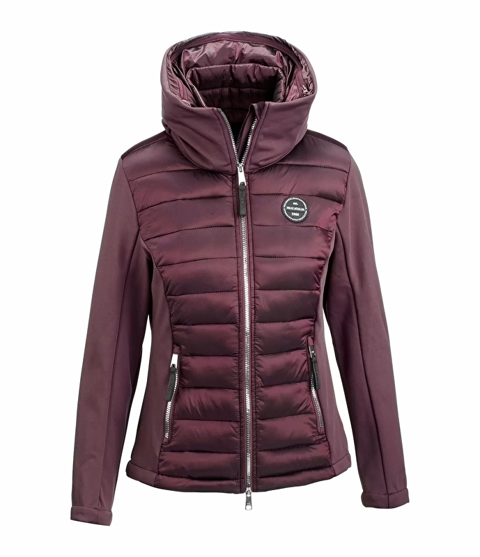 Niezwykle elegancka kurtka jeździecka wykonana z elastycznego softshellu i miękkiego pikowanego materiału. Wiatroodporna. Podwójny kołnierz, chowany, pikowany kaptur w dużym kołnierzu zewnętrznym z zamkiem i pięknym haftem. Błyszczący, dwukierunkowy zamek błyskawiczny z przodu z podszewką oraz 2 kieszenie na suwak z przodu i naszywka Felix Bühler na piersi. Regulowana szerokość dołu. Przednia część, wewnętrzny kołnierz i kaptur 100% nylon, powierzchnia softshell 100% poliester.