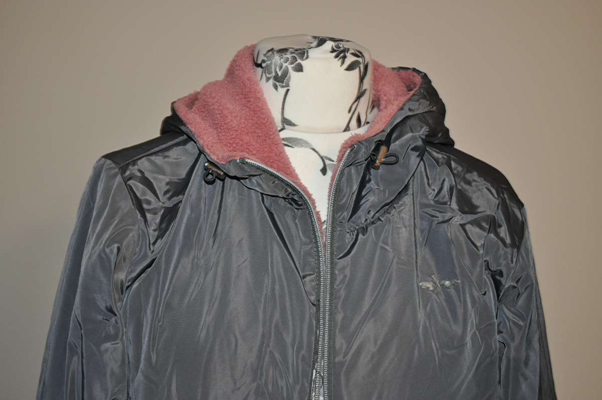 Kurtka posiada zepsuty zamek oraz na jednej ze stron rozpruty materiał przy kieszeniach czy na szwie na różowej stronie są pojedyncze plamy - zdjęcia.