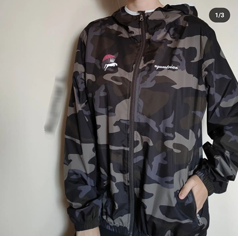 Kurtka jezdziecka przeciwdeszczowa wododporna z spooks. Fajny motyw moro. Ma kieszenie na zamek. Dół i rękawki na gumce przez co łatwo dopasujesz ją do swojej sylwetki. Duży kaptur pomieści kask. Rozm z metki L krój jest ovsersize by móc ją założyć na inną kurtkę czy bluzę