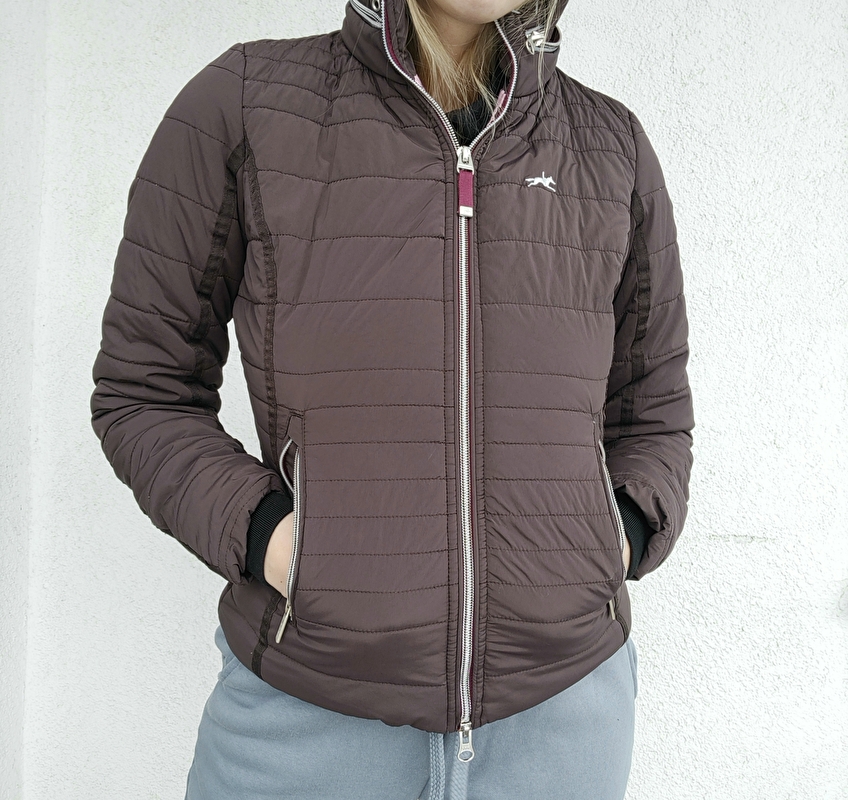 Kurtka przejściowa lekko wypełniona jeździecka Schockemohle. Bardzo ładnie leży na sylwetce. Kaptur chowany w kołnierzu lekki. Stan bardzo dobry. Nie zauważyłam wad. Może mieć ślady użytkowania na metalowym logo. Rozmiar XS szerokość 44 cm x2 dl całkowita od ramienia 53 cm Dl rękawa 47 cm