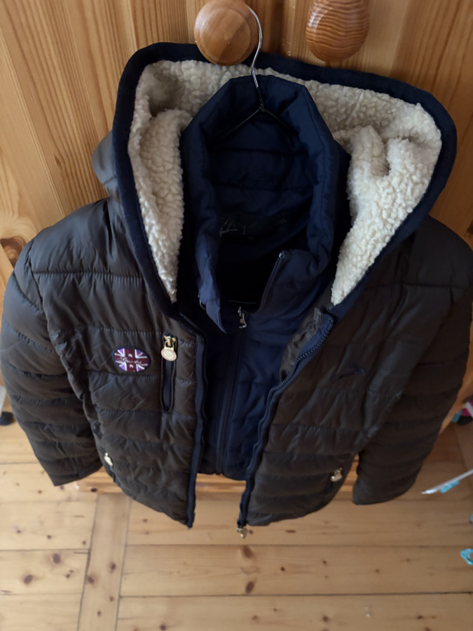 Jak nowa, jesienno-zimowa, kolor brązowy (czekoladowy) z granatowym wiatrołapem i jasnobrązowym barankiem w kapturze, rozmiar XS, cena 130zl