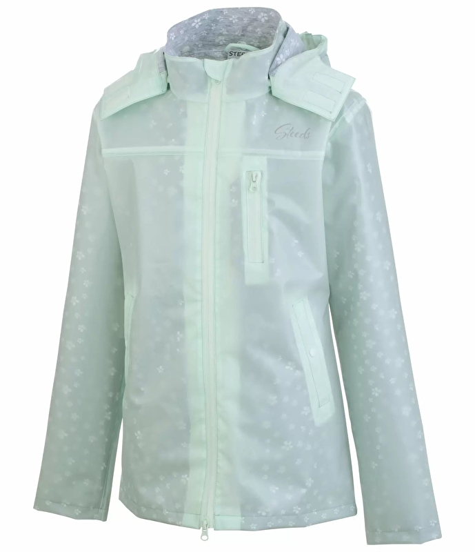 Dziecięca kurtka przeciwdeszczowa, przezroczysta , z podszewką w kwiaty. Materiał wodoodporny, wiatroszczelny - idealny na deszczowe dni. Wodoodporny zamek z przodu, kieszeń na piersi zapinana na zamek, 2 wsuwane kieszenie i odpinany kaptur. 100% poliuretan. a 65% poliester, 35% bawełna.