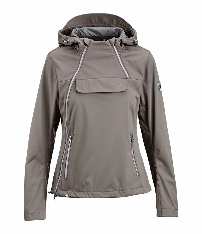 Sportowa kurtka jeździecka typu softshell z kapturem i wieloma pięknymi detalami. Wodoodporna i wiatroszczelna. Zabudowana pod szyją, regulowany kaptur z błyszczącą podszewką, którą można zapiąć z tyłu. Asymetryczne zamki z bocznym, dwukierunkowym zamkiem błyskawicznym na całej długości i osłoną podbródka. 1 kieszeń na piersi z nadrukiem STEEDS, 2 przednie kieszenie na suwak i regulowana szerokość u dołu. Naszywka STEEDS na rękawie. Materiał: 100% poliester.