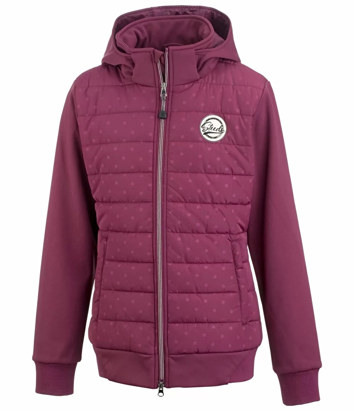 Funkcjonalna dziecięca kurtka jeździecka softshell z ciepłymi pikowanymi wstawkami. Wodoodporny i wiatroodporny materiał. Z połyskującym wzorem w kropki, naszywką z logo na piersi, z 2 przednimi kieszeniami na suwak, dwukierunkowym suwakiem z przodu, ściągaczami na dole i rękawach. 100% poliestru.