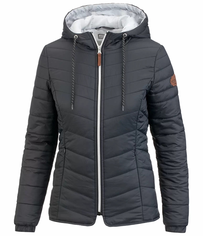 Ponadczasowa, pikowana kurtka z kapturem i podszewką w kontrastowym kolorze. Lekko wyściełana i wiatroszczelna na okres przejściowy. Kaptur można przymocować do jazdy za pomocą praktycznej napy. Skórzane logo marki na ramieniu. Dwukierunkowy zamek w kolorze srebrnym, 2 ukryte kieszenie na zamek, regulowany kaptur. Tkanina zewnętrzna 100% nylon, podszewka 100% poliester.