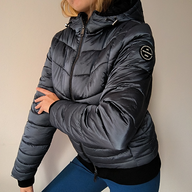 Kurtka jezdziecka zimowa Felix Bühler. Srebrna lekko holo. Super wygląda na sylwetce. Nowszy model. Ma spory kaptur który można przypiąć do pleców podczas jazdy. Zdecydowanie jest godna polecenia. Bardzo wygodna. Kryte kieszenie na zamek. Stan bardzo dobry. Rozmiar 36 s szerokość 48 cm x2 dl całkowita od ramienia 64 cm Dl rękawa od pachy 50 cm