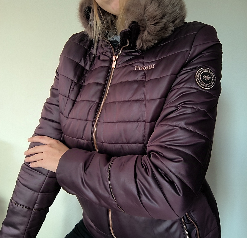 Kurtka jezdziecka Pikeur. Kolor śliwkowy z elementami rosegold. Z futerkiem na kołnierzu milusi. Kurtka ciepła z wypełnieniem. W pasie Ala pasek ładnie nadaje talii kształt. Super wygodna ładnie się prezentuje. Od spodu print. Stan bardzo dobry. Rozmiar M