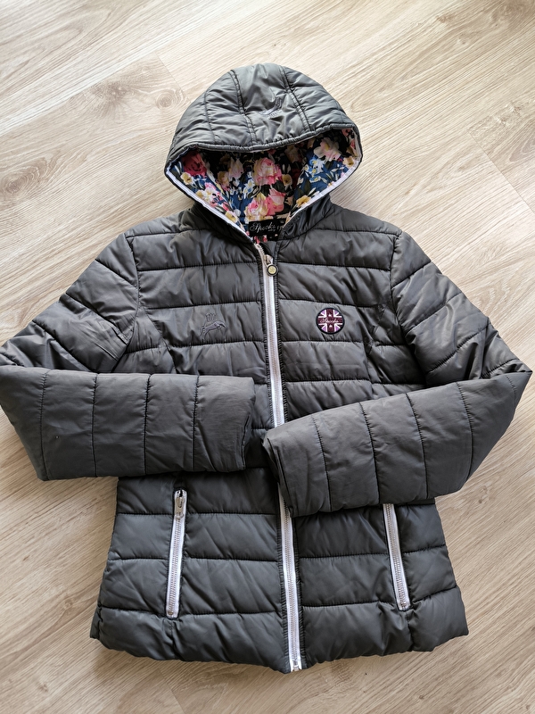 Kurtka zimowa jeździecka Spooks. Szara z kwiecistym wzorem od środka na kapturze. Kaptur sam w sobie duży. Na stałem super wykonana wygodna. Stan bardzo dobry lekkie ślady użytkowania. Rozmiar M szerokość 50cmx2 dl całkowita od ramienia 63 cm Dl rękawa od pachy 50cm