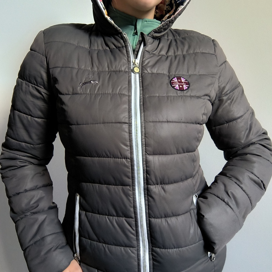Kurtka zimowa jesienna jeździecka Spooks. Szara z kwiecistym wzorem od środka na kapturze. Kaptur sam w sobie duży. Na stałe. super wykonana wygodna. Stan bardzo dobry lekkie ślady użytkowania. Rozmiar M szerokość 50cmx2 dl całkowita od ramienia 63 cm Dl rękawa od pachy 50cm