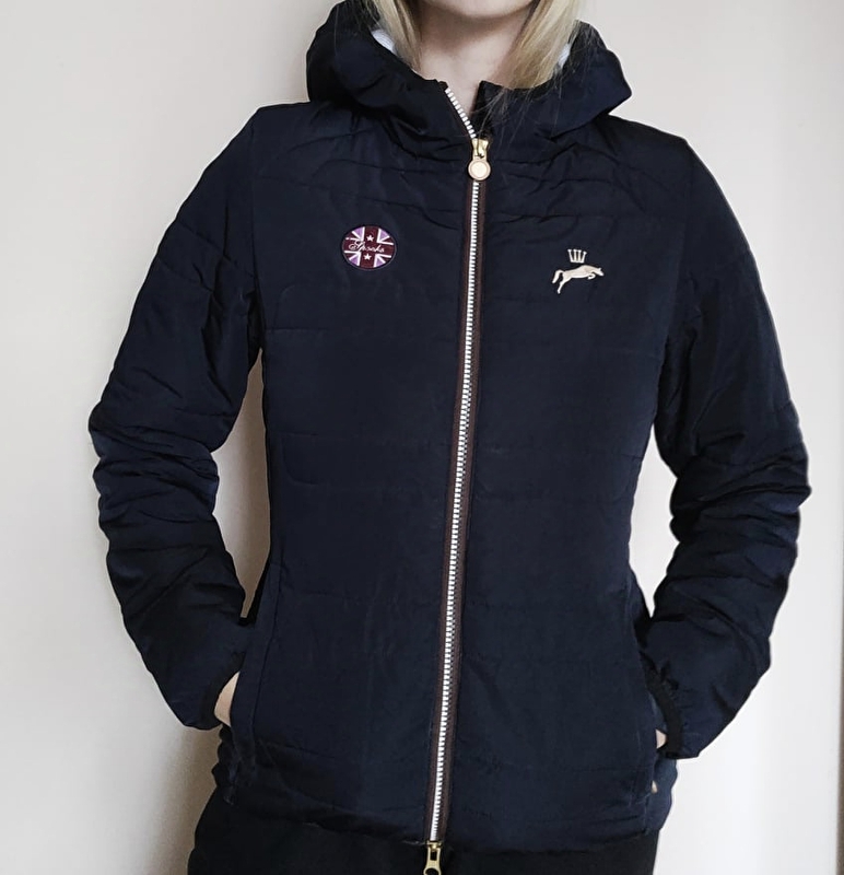 Kurtka jezdziecka zimowa. Granatowa. Świetnie skrojona z kapturem na stałe. Z łatkami na łokciach. Świetny model zapewnia optymalne ciepło. Stan bardzo dobry. Rozmiar XL szerokosc 54cm x2 dl całkowita od ramienia 65 cm Dl rękawa od pachy50 cm za 330 zł