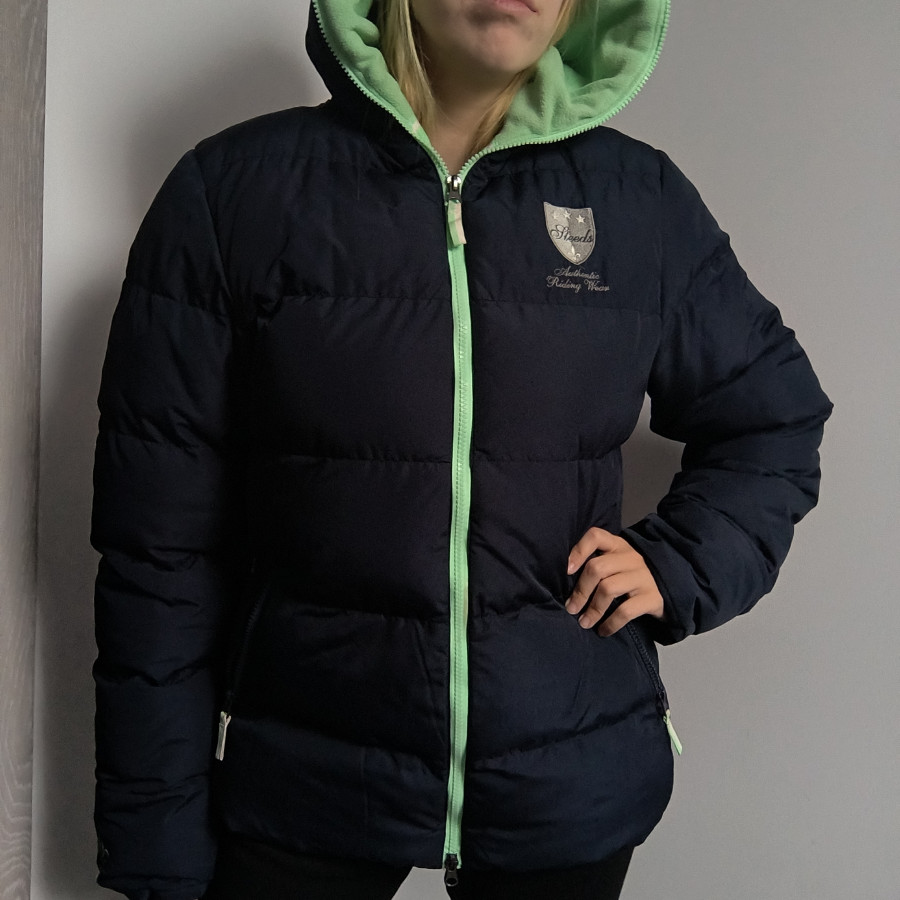 Kurtka jezdziecka zimowa steeds..solidna porządna ciepła. Gruba. Granatowa z kominkowym obszyciem i kapturem. Kaptur spory zapinany aż po sam koniec i podszyty polarem. Kieszenie też na zamek. Bardzo komfortowa i godna uwagi. Stan bardzo dobry. Rozmiar L 40 szerokość 53 cm x2 dl całkowita 67 cm Dl rękawa od pachy 50 cm