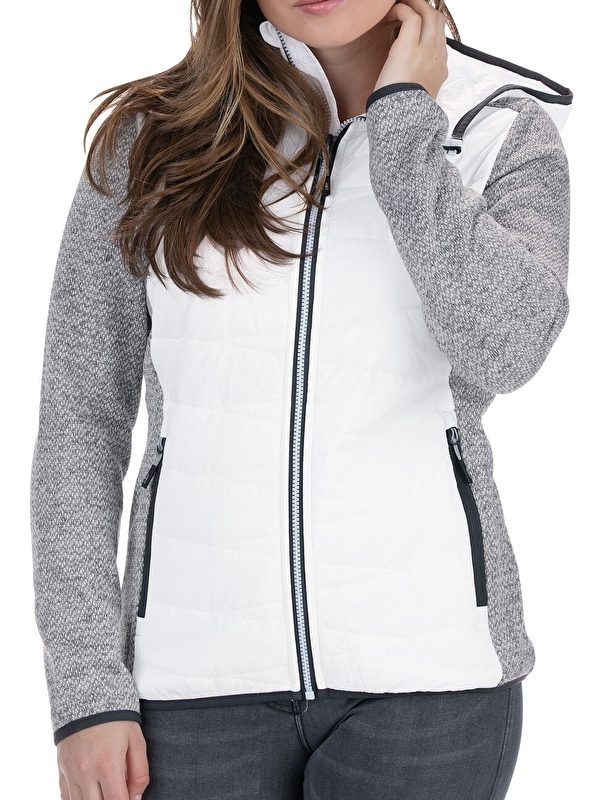 Sportowa lekko pikowana kurtka z kapturem i funkcjonalnym materiałem zewnętrznym z nylonu hybrydowego w przedniej czesci. Wysokiej jakości imitacja puchu.