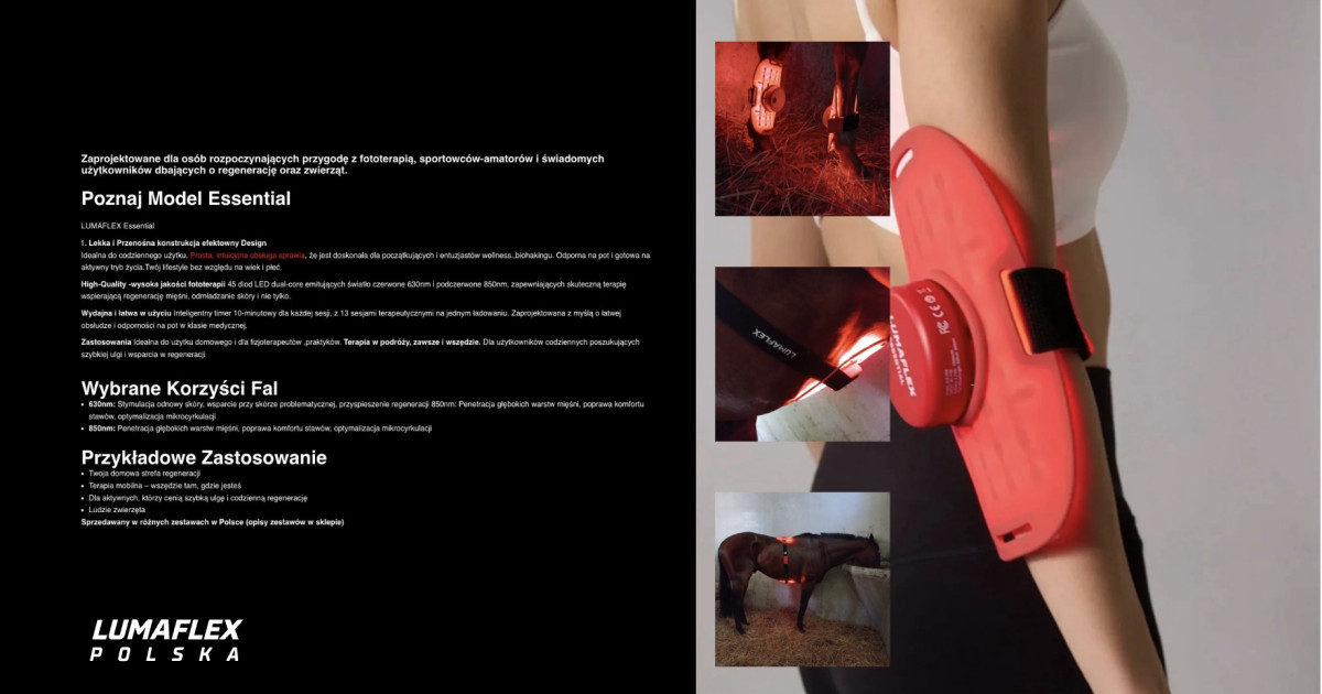 Essential wykorzystuje długość fali światła czerwonego 630 nm + długość fali podczerwieni 850 nm w połączeniu z odpowiednimi częstotliwościami i czasem oraz natężeniem w sesji 10 minutowej.Flex który umieścisz bezpośrednio na skórze.
