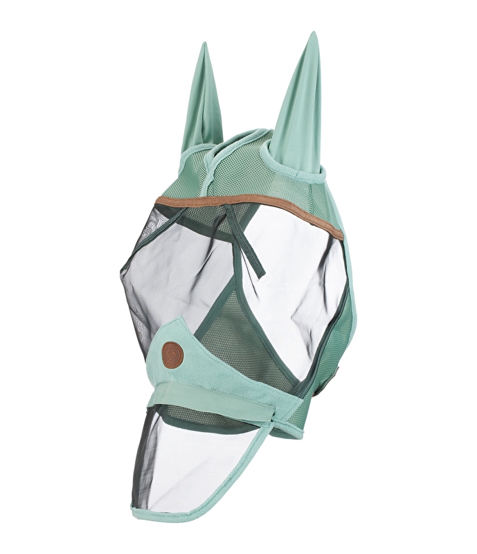 Sportowa i funkcjonalna maska przeciw muchom z odpinaną osłoną nozdrzy dzięki praktycznemu systemowi KV i wytłoczonym naszywkom z logo imitacji skóry. Podwójny KV i elastyczny materiał na uszy dla dobrego dopasowania rozmiaru i dopasowania. Obrzeże z polaru dookoła, aby uniknąć otarć, a także siatka chroniąca przed muchami o małych oczkach ze szwem dystansowym w polu widzenia, zapewniającym bezpieczną odległość od oczu. 100% poliestru.