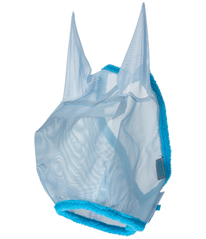 Ochronna maska przeciw muchom wykonana z przepuszczającego powietrze materiału siatkowego z ochroną UV 65+ i bezpieczną odległością od oczu. Obszycie z puszystego polaru . Profilowany kształt sprawia, że maska przylega do głowy konia. Materiał odbija promienie słoneczne