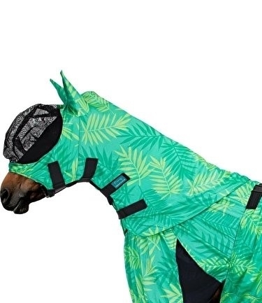 Maska przeciw owadom - egzemowa, wykonana ze specjalnego, oddychającego funkcjonalnego materiału z włókien w letnim stylu z subtelnym nadrukiem. Zapobiega nadmiernemu poceniu się i szybko wysycha. Odporna na promieniowanie UV. Ma doskonałe dopasowanie, które zapewnia nieograniczoną swobodę ruchów. Maska z przedłużeniem zapewnia dodatkową ochronę i jest w razie potrzeby mocowana do derki. 100% poliester (włókno funkcjonalne).
