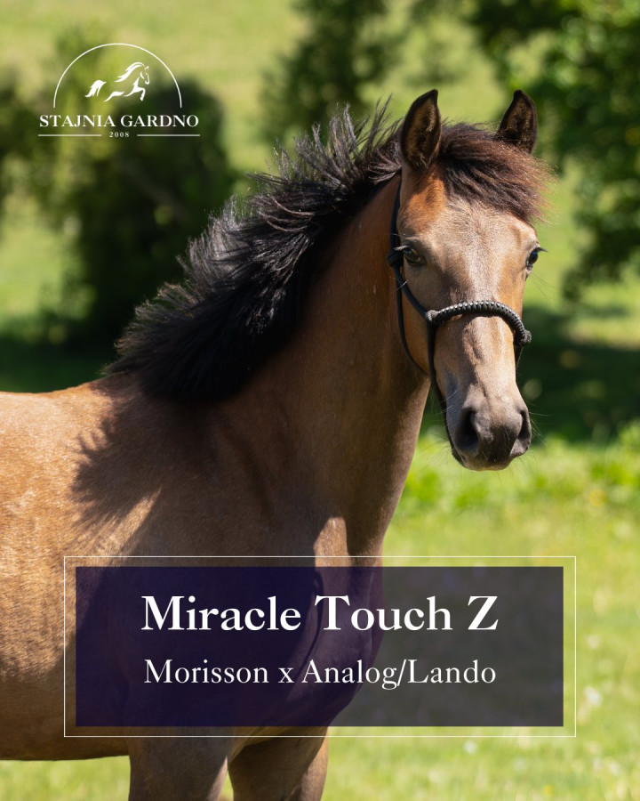 Miracle Touch Z to roczna klaczka o wyjątkowej maści( będzie siwa), jest bardzo towarzyska i skoczna.