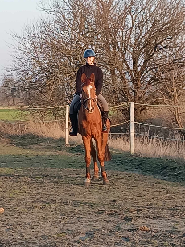 Wstępnie zajeżdżony, niewiele czasu spędził pod siodłem ze względu na swój wiek- ma jeszcze trochę czasu na rozwój. Potrafi przejścia, świetnie chodzi na lonży. Potrafi rozwinąć dużą prędkość kiedy się tego od niego wymaga. Bardzo dobrze idą mu początki skręcania. W ostatnim czasie nie jeżdżony, więc na pewno do spokojnego przypomnienia. Jednorazowo był również zaprzęgnięty do opony. Oczywiście wymaga jeszcze żeby poświęcić mu czas i nauczyć go kolejnych elementów, ale chłonie wiedzę z ciekawością i na pewno za ten poświęcony czas się odwdzięczy. Podczas czyszczenia, ubierania oraz w boksie jest bardzo grzeczny. W stadzie nisko w hierarchii, nie sprawia problemów, szanuje pastuch.