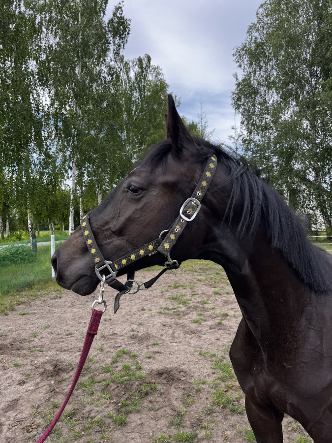 Maści skarogniadej, poprawnie zbudowany, dobrze galopujący, odważny z potencjałem skokowym.
