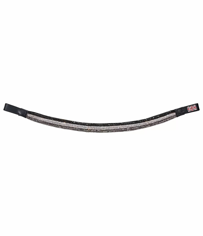 Wyjątkowy, trzyrzędowy, zakrzywiony naczółek. Składa się z 3 brokatowych pasków w kolorze szarym, białym i czarnym, które są ozdobione niezliczoną ilością błyszczących kamieni brokatowych i tworzą piękne przejście kolorów. Pętle ze skóry olejowanej. Wymiary: COB = 41 cm,