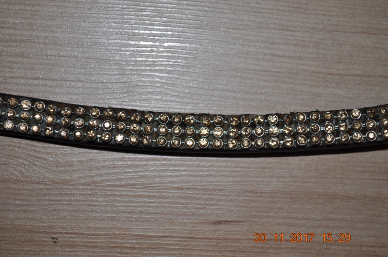 Posiadam na sprzedaż kilkadziesiąt naczółków, na ciemnej, brązowej skórze, zdobionych jasnymi cyrkoniami w trzech rzędach, cena 15 zł za sztukę. Naczółki są nowe, powystawowe. Klejona skóra ulega rozwarstwieniu, należy ją podkleić. Jest to starszy model.