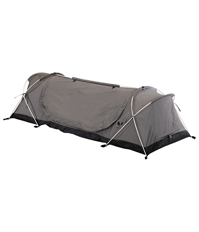 Idealny na noclegi pod gwiazdami: lekki, zajmujący mało miejsca, solidny i wodoodporny namiot 1-osobowy (słup wody 3000 mm) z klejonymi szwami. Szybki i łatwy w konfiguracji. Wyposażony w cztery lekkie, składane aluminiowe łuki, aluminiowy słupek na środkową część namiotu, praktyczną torbę do przechowywania oraz karabińczyki zapewniające bezpieczne stojaki. Wejście i wyjście z namiotu jest zabezpieczone przed wnikaniem owadów dodatkową wkładką przy użyciu siatki chroniącej przed owadami. Siatkę i wodoodporny pokrowiec można otwierać i zamykać za pomocą podwójnych zamków błyskawicznych, a dzięki urządzeniu można je również zwijać i składać. Okna wentylacyjne na dwóch krótkich bokach są również chronione przed owadami za pomocą materiału siatkowego. Po rozłożeniu namiot ma wymiary całkowite 205 x 80 x 50 cm, dzięki czemu zapewnia wystarczająco dużo miejsca dla jednej osoby. Wymiary opakowania to 54 x 16 x 17 cm, a waga około 2,5 kg. Materiał zewnętrzny 65% poliester, 35% bawełna, wstawka z siateczki 100% poliester, podłoga namiotu 100% polioxford (210 denierów), maszty namiotowe 100% aluminium.
