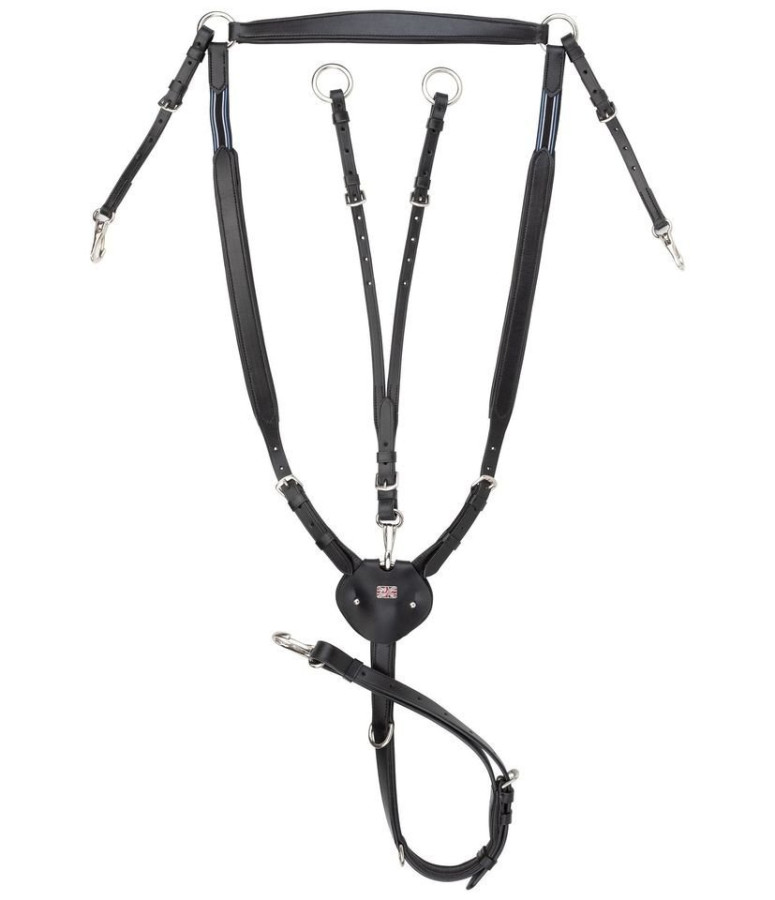 Sportowy krój, napierśnik z regulacją rozmiaru, który zapobiega zsuwaniu się siodła do tyłu i nadal zapewnia idealną swobodę ruchów dzięki elastycznym wstawkom po obu stronach. Proste mocowanie do siodła i popręgu siodła za pomocą praktycznych zatrzaskowych karabinków. Punkt ucisku na klatce piersiowej i miękka skórzana wyściółka na kłębie. Elastyczne zastosowanie dzięki regulowanemu i wyjmowanemu widelcowi wytokowemu oraz dodatkowym D-ringom. Okucia w kolorze srebrnym.