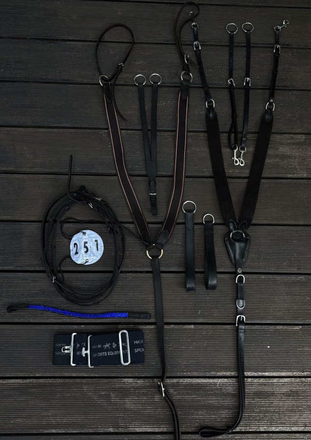 Sprzedam pojedynczo lub w komplecie rzeczy różne: niebieski naczółek stan bardzo dobry; antypoślizgowe wodze Start, numerek startowy i dwa napierśniki wraz z wytokami widoczne na zdjęciu☺️ Zapraszam do kontaktu po więcej informacji, CENY do dogadania i negocjacji!