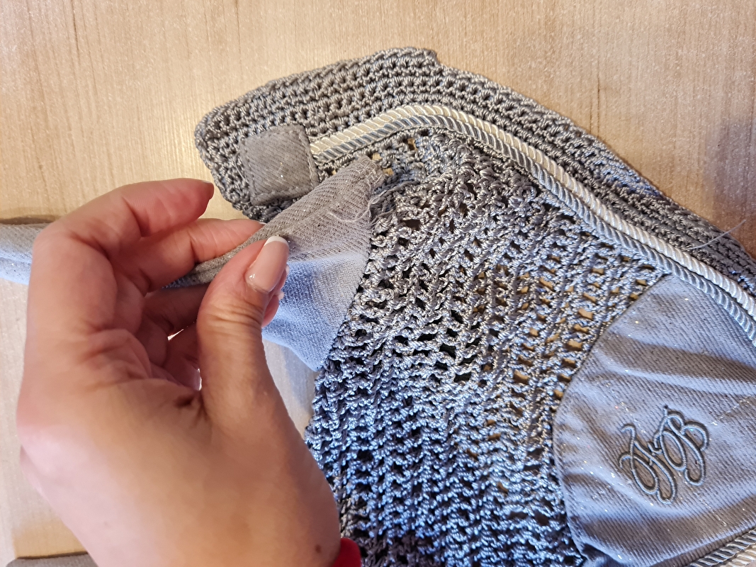 Nauszniki w kolorze srebrnym, z haftem z przodu, ozdobnymi sznurkami, brokatem na materiale przylegającym do uszu. Sprawne. Rozmiar z metki full. Rozprucie widoczne na zdjęciu
