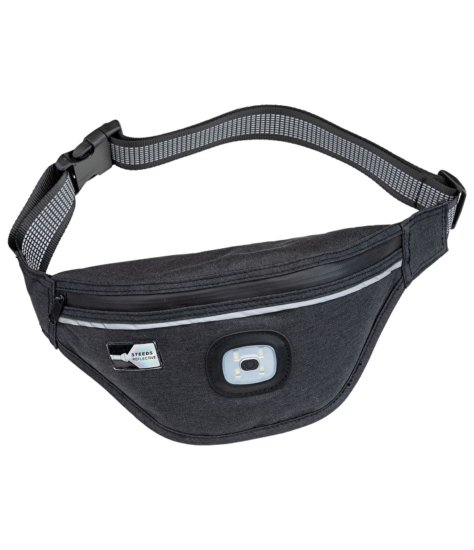 Funkcjonalna saszetka biodrowa z wyjmowaną diodą LED (jasność 90 lumenów, możliwość ładowania przez USB, czas świecenia do 4 godzin, 3 poziomy jasności, zasięg 20 m), odblaskowymi paskami z przodu i odblaskowym paskiem z zapięciem na klips. Zmywalna, wodoodporna podszewka. 100% poliester.