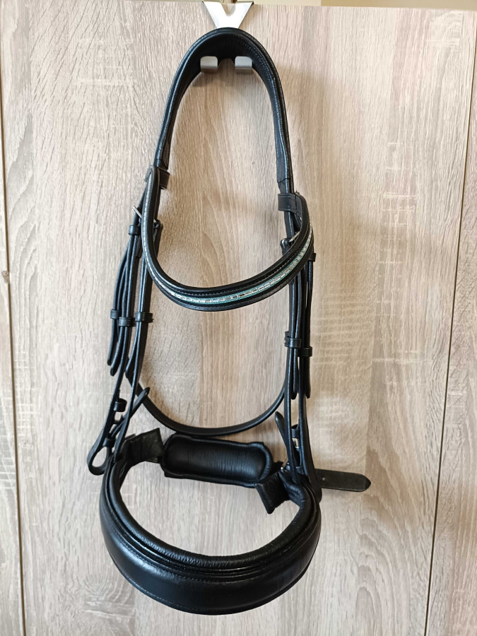 Dzień dobry, sprzedam NOWE ogłowie w rozmiarze FULL w kolorze czarnym. Ogłowie w super stanie, skóra miękka i elastyczna. Przepiękny zdobiony naczółek, wszystkie kryształki na miejscu. Nachrapnik zdobiony wstawkami. Prezentuje się przepięknie.