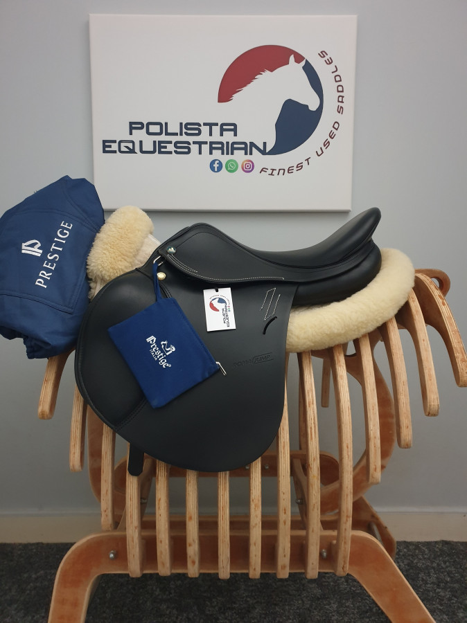 FABRYCZNIE NOWE siodło skokowe Prestige Roma Jump. Bardzo popularny model, panele wełniane, rozstaw łęku można zmienić w Equishop. Rozmiar 16/34 (wypada 16.5"),tybinki 34.5cm, wyprodukowane w połowie 2022, jeszcze nie widziało konia. W zestawie z nowym pokrowcem.