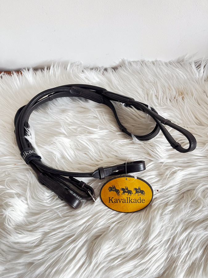 Sprzedam nowe, oryginalne wodze Softlederzügel „Florina”, wersja W, okrągłe (rundgen), szerokość 16 mm. Okrągło szyte wodze z niemieckiej skóry wysokiej jakości. Wersja wąska 16 mm z pięcioma przelotkami i okuciami w kolorze srebrnym. Rozmiar W (1,40 m). Kolor Brązowy