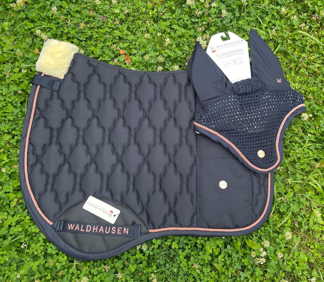 Granatowy czaprak z kieszonką i podszyciem futerkiem przy kłębie oraz nauszniki. Całość ze sznurkową bizą w kolorze różowego złota. Cena kompletu w sklepie ok. 269 zł.