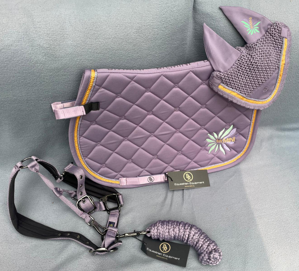 Wyjątkowy, unikalny komplet dla szetlanda BR Mini Horse: czaprak, nauszniki i miękko podszywany kantar z uwiązem.