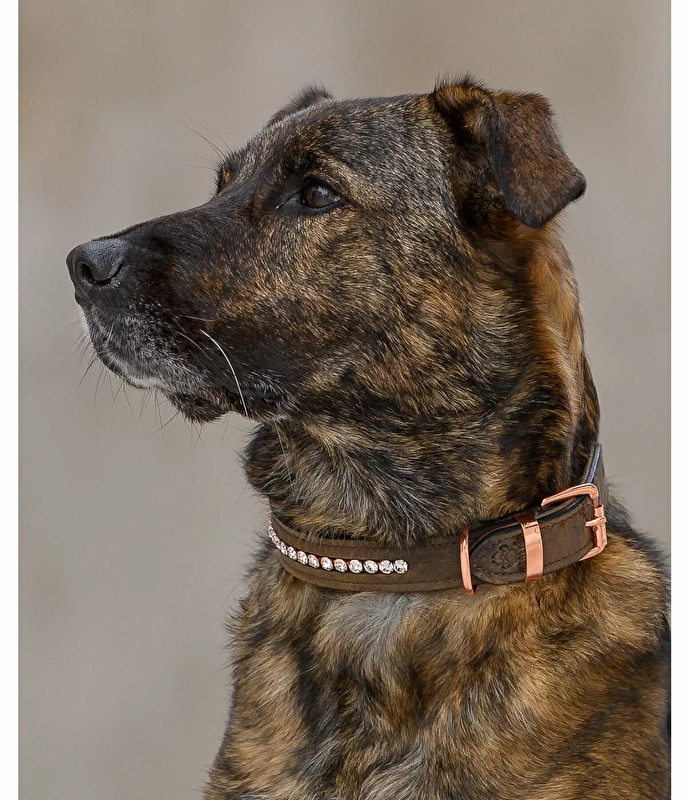 Wysokiej jakości obroża dla psa wykonana z olejowanej skóry naturalnej o wyglądzie używanym z rzędem błyszczących, białych cyrkonii z lamówką w kolorze różowego złota. Miękka wyściółka zapewniająca wysoki komfort noszenia. Okucia w kolorze różowego złota.