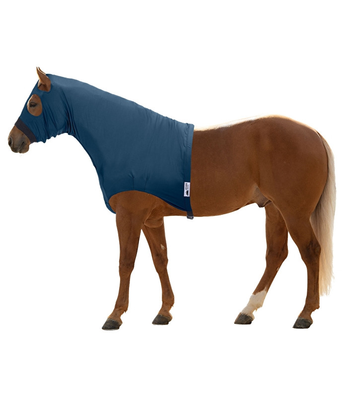 Praktyczny ochraniacz, wykonany z elastycznego materiału. Chroni grzywę i sierść przed zabrudzeniem, m.in. przed turniejem. Zapinany za przednimi nogawkami na rzep. Zamek pod szyją ułatwia zakładanie i zdejmowanie. 85% poliester, 15% elastan.