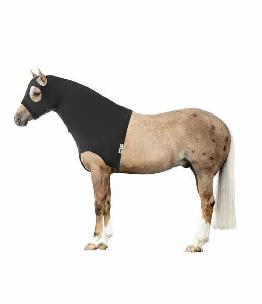 Praktyczny ochraniacz, wykonany z elastycznego materiału. Chroni grzywę i sierść przed zabrudzeniem, m.in. przed turniejem. Zapinany za przednimi nogawkami na rzep. Zamek pod szyją ułatwia zakładanie i zdejmowanie. 85% poliester, 15% elastan.