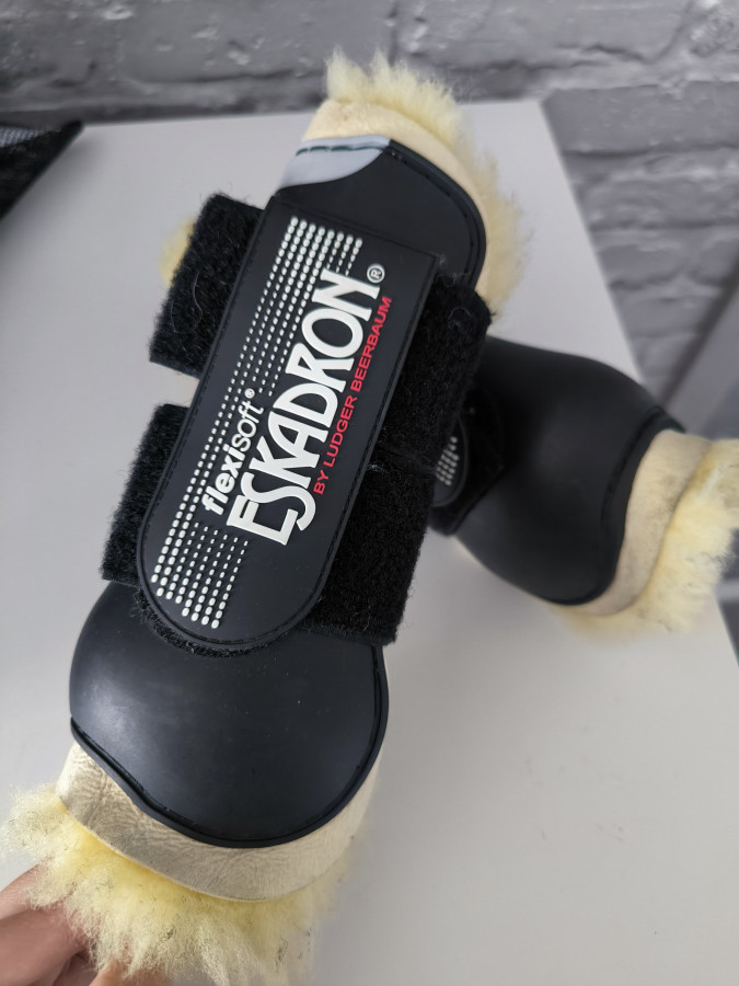 Ochraniacze eskadron Flexisoft. Czarne. Świetnie wykonane. Wnętrze ochraniaczy jest z owczej wełny naturalne futerko jest idelane dla koni wrażliwych z delikatną skórą. Hipoalergiczne delikatne naturalne właściwości pozwalają na to by w futrze nie przegrzać kopyta. Jest też dodatkowa Ala skórka pod samą Skorupka która chroni zarówno pecine jak i to aby nie obcieral się od spodu ochraniacz. Rzepy są bardzo mocne mocno trzymaja. Są w świetnym stanie. Zarówno na zewnątrz i wewnątrz. Mało używane. Na zdjęciach uchwycilam je dokładnie z każdej strony. Rozmiar Pony