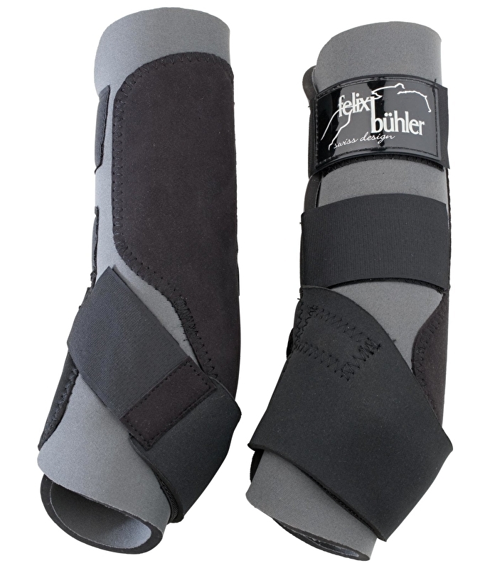 Szczególnie komfortowe ochraniacze ujeżdżeniowe wykonane z gumy chloroprenowej. Zapobiegają obrażeniom spowodowanym przez uderzenia, szczególnie w bocznych bokach i wzmocnieniach. 3 szerokie paski na rzepy zapewniają optymalne wsparcie ścięgien i więzadeł. 100% guma chloroprenowa.