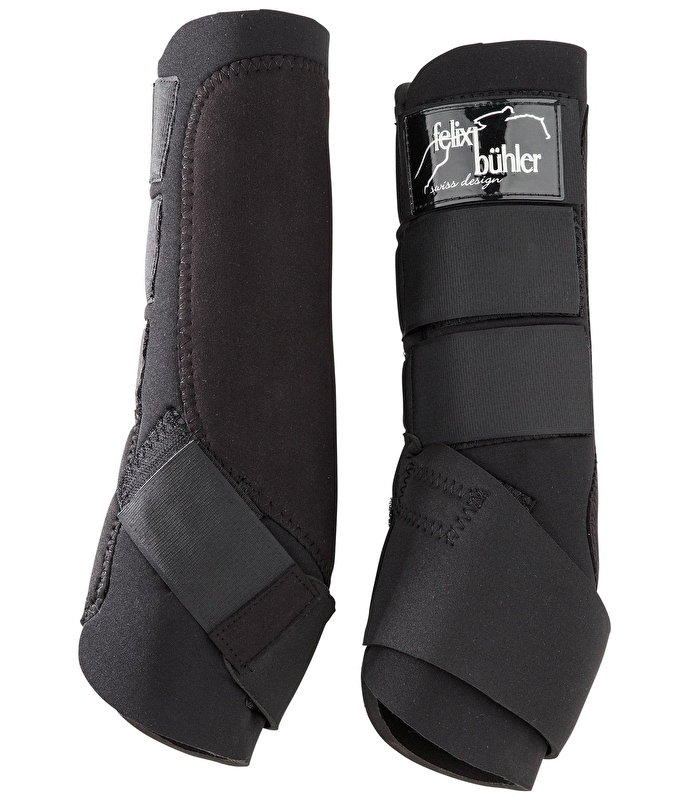 Szczególnie komfortowe ochraniacze ujeżdżeniowe wykonane z gumy chloroprenowej. Zapobiegają obrażeniom spowodowanym przez uderzenia, szczególnie w bocznych bokach i wzmocnieniach. 4 szerokie paski na rzepy zapewniają optymalne wsparcie ścięgien i więzadeł. 100% guma chloroprenowa.