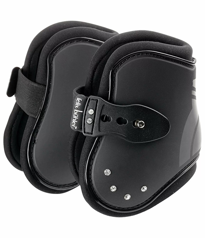 Ochraniacze z twardą skorupą o anatomicznym kształcie. Dają nodze konia optymalną swobodę ruchu podczas skoku. Cyrkonie na zewnątrz przyciągają wzrok. Wewnętrzna wyściółka z miękkiej gumy chloroprenowej i z system szybkiego uwalniania.