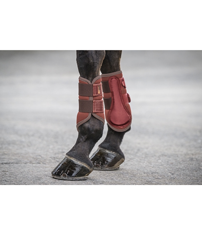 Niezwykle oddychające, miękkie ochraniacze na przednie nogi wykonane z tkaniny siateczkowej, która umożliwia stałą cyrkulację powietrza. Z elastycznymi KV dla optymalnego dopasowania rozmiaru i błyszczącą metalową blaszką z logo. Wzmocnienie od wewnątrz dla dodatkowej ochrony przed uderzeniami. Polarowe obszycie dookoła chroni przed otarciami. 100% poliestru.