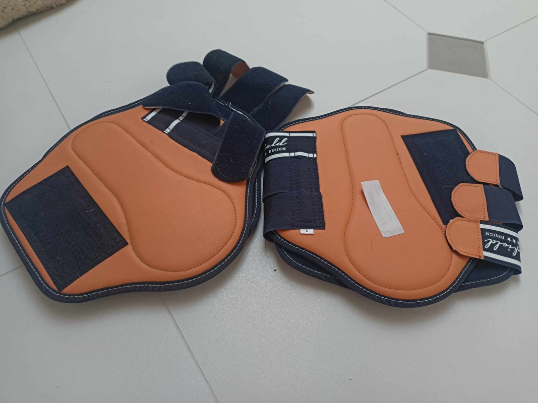 Sprzedam, nieużywane (jeszcze z metkaki), ochraniacze marki Fairfield. Komplet zawiera 4 sztuki ochraniaczy (pary nie różnią się od siebie) w kolorze pomarańczowym, w rozmiarze L/full, zapinane na 3 rzepy, podszyte miękkim neoprenem. Stan widoczny jest na zdjęciach (1 sztuka posiada drobną plamę). Cena 130 zł.