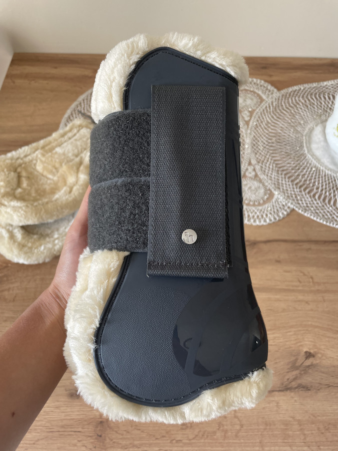Sprzedam komplet ochraniaczy z futerkiem, firmy Horze, rozmiar full. Kolor granatowy, bardzo mało używane, założone na 2 przejazdy na zawodach i po zawodach od razu wyprane, nie posiadają żadnych śladów użytkowania, nie są popękane, rzepy całe.