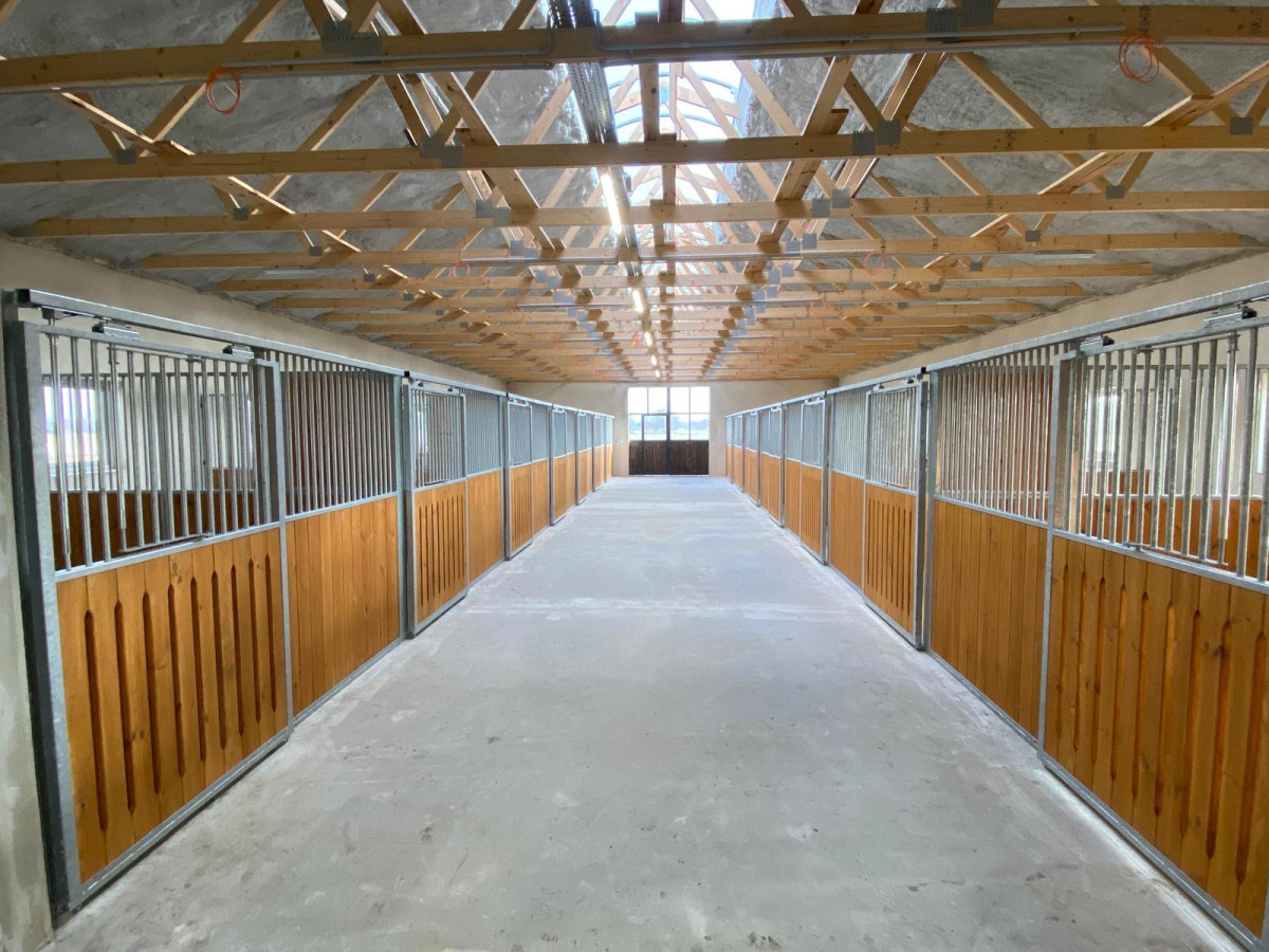 Budynek murowany, widny z dużym świetlikiem, każdy boks 12m2 z własnym oknem, automatyczne poidła. Szeroki bezpieczny korytarz.