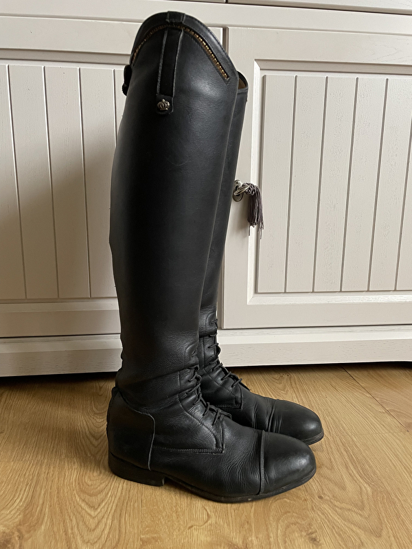 Sprzedam używane wszechstronne oficerki jeździeckie Köenigs. Wykonane z najwyższej jakości skóry wołowej. Taliowane w kostce z dodatkowym elastycznym sznurowaniem, które umożliwia lepsze dopasowanie w kostce. Zapinane na zamek z tyłu buta. Gumowa wstawka wzdłuż zamka. Słynna korona Köenigs na pasku.W górnej części zdobione złotymi cyrkoniami. Klasyczna podeszwa. Rozmiar 5 i 1/2 czyli 38 1/2. Stan jak na zdjęciach.