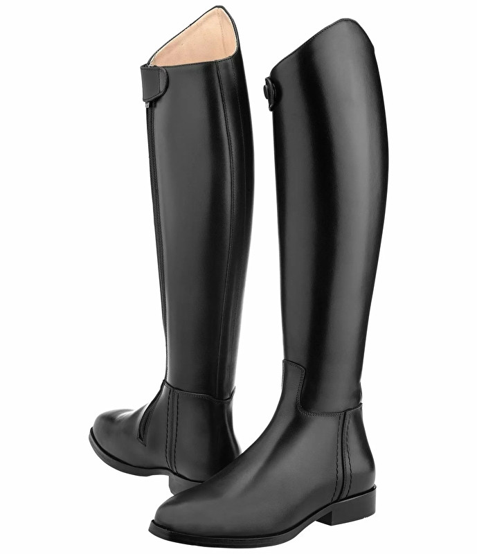 Profesjonalne oficerki ujeżdżeniowe wykonane z najlepszej skóry cielęcej pochodzącej z Niemiec. Z zewnętrznym wzmocnieniem Długi zamek OPTI po wewnętrznej stronie przodu. Wewnętrzna wyściółka wykonana z bardzo miękkiej skóry bydlęcej. Podeszwa zewnętrzna o smukłym, kwadratowym kształcie wykonana jest ze skóry i zabezpieczona gumową powłoką w przedniej części stopy i pięcie. Wyjmowana wkładka wykonana jest z amortyzującego materiału pokrytego od góry skórą bydlęcą. Ręczne szycie w obszarze pięty dopełnia eleganckiego wyglądu tych butów ujeżdżeniowych. Wyprodukowano w Portugalii.
